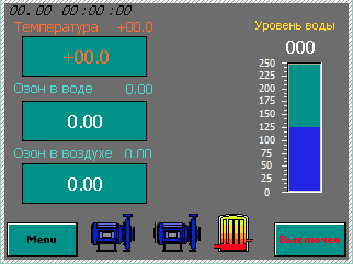 Основное меню, где индицируются  значения температуры, содержание озона в воде и воздухе, работа насосов, теплообменник.