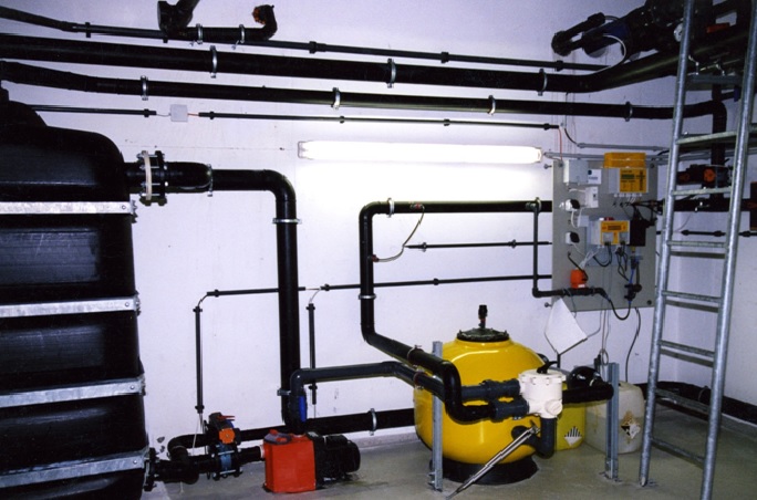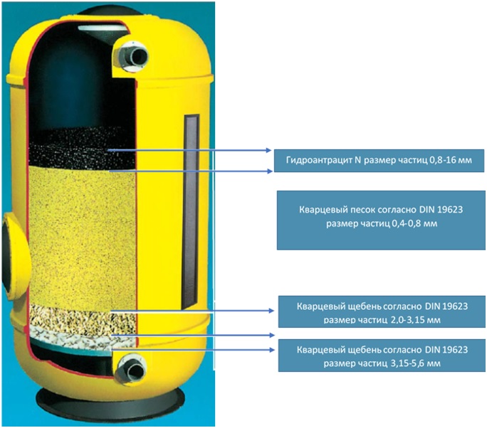 Фильтровальная установка для бассейнов состоит из фильтрующей ёмкости и циркуляционного насоса, засыпка может быть однослойной и многослойной. Материал загрузки определяется исходя из требований технологии очистки воды. Фильтрующая загрузка имеет определенную грязеемкость, по достижении которой необходимо проводить очистку, которая производится путем обратной промывки. Сорбенты имеют ограниченную сорбирующую способность, поэтому по истечении срока службы сорбирующая загрузка должна быть заменена.